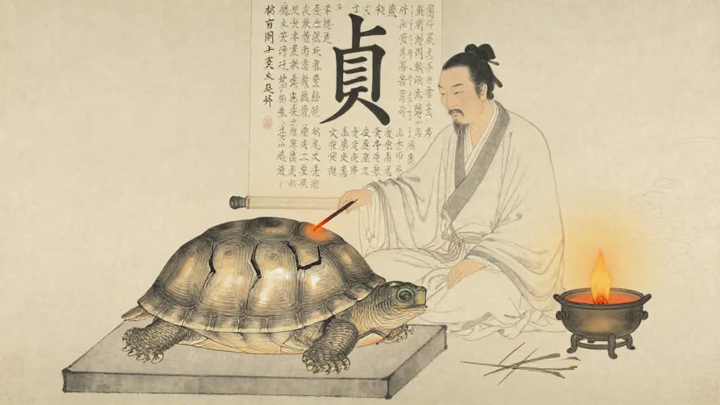 In the earliest stratum of Chinese writing — the oracle bone inscriptions of the Shang court, from roughly 1250 BC — 貞 is a verb. It does not mean to persevere. It does not mean to be steadfast. It does not mean to hold to one's course. It means, simply, to divine — to put a question to the oracle, to crack the bone, to read the answer.