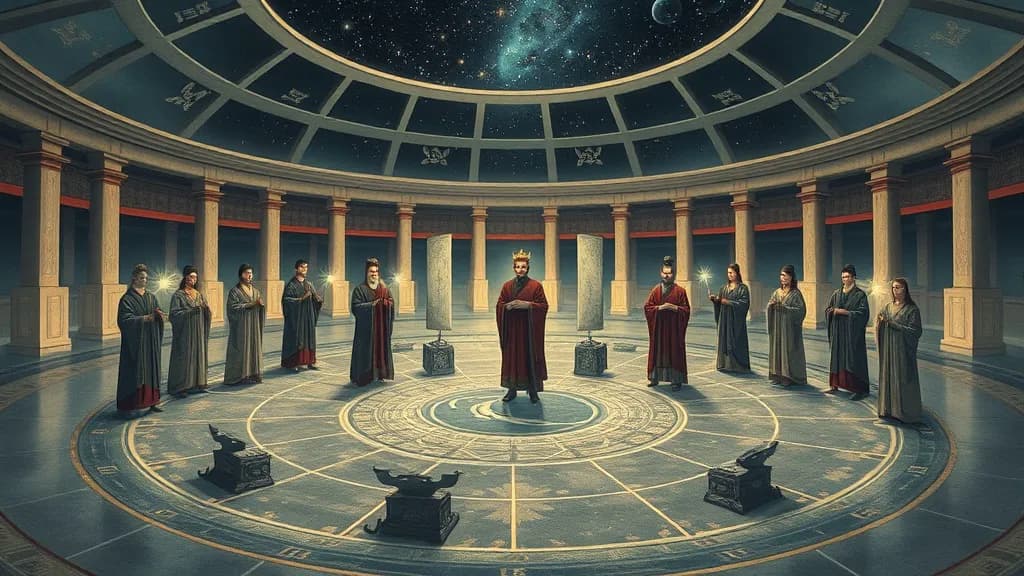 The eight Southern Dipper (南斗) stars move in the opposite direction from the Northern group. Their positions are calculated from Tianfu—the Treasury star—which moves inversely to Ziwei. If the Northern Dipper is the emperor's court, the Southern Dipper is the administrative apparatus that actually runs the empire.